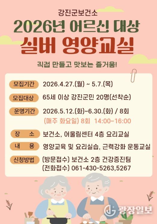 광장일보 주재영 기자 | 강진군보건소가 65세 이상 어르신을 대상으로 건강 증진을 도모를 위한 ‘실버 영양교실’ 프로그램을 운영한다.