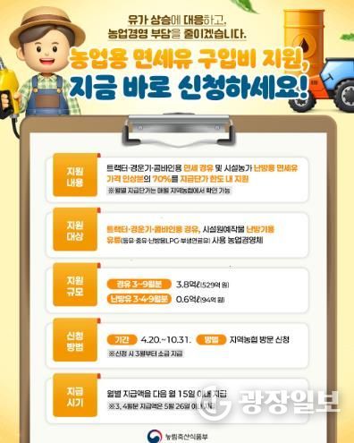 광장일보 주재영 기자 | 농림축산식품부는 최근 중동 지역 정세 불안으로 인한 국제유가 상승에 대응하기 위하여 농업인의 유류비 부담을 완화, 농가 경영 안정을 지원하기 위해 '농업용 면세유 유가연동 보조금 지원사업'을 추진한다고 밝혔다.