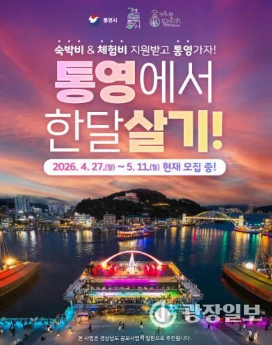 광장일보 주재영 기자 | 통영시는 체류형 관광 활성화와 지역 경제 활성화를 위해 ‘통영애(愛)온나(2026년 경남에서 한 달 여행하기)’사업 1차 참가자를 오는 5월 11일까지 모집한다.