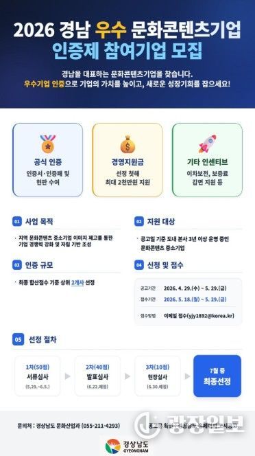 광장일보 주재영 기자 | 경상남도는 ‘2026년 경남 우수 문화콘텐츠기업 인증제’ 참여 기업을 4월 29일부터 5월 29일까지 한 달간 모집한다고 밝혔다.