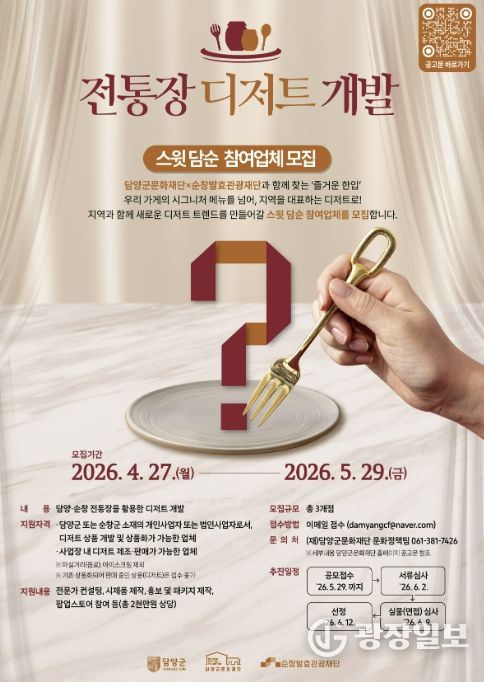 광장일보 주재영 기자 | 담양군문화재단이 순창발효관광재단과 함께 지역 전통장을 활용한 디저트 개발 프로젝트 ‘스윗 담순’ 참여업체를 모집한다.