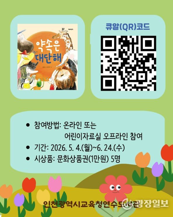 광장일보 주재영 기자 | 인천광역시교육청연수도서관은 어린이들이 다양한 도서를 접할 수 있도록, 5~6월 어린이 독서퀴즈 ‘책 속에서 보물찾기’를 운영한다.