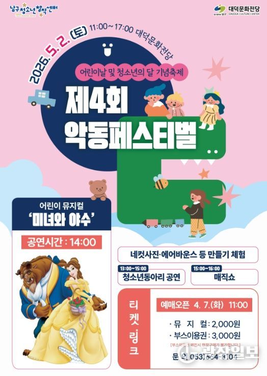 제4회 악동페스티벌은 가족이 함께 즐길 수 있는 어린이 뮤지컬 '미녀와 야수'공연과 대덕문화전당 야외광장에서 펼쳐지는 어린이와 청소년을 위한 △에어바운스, △네컷사진, △바람개비 만들기 등 다양한 체험활동 등이 진행된다.