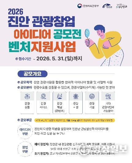 광장일보 주재영 기자 | (사)진안군관광협의회(이사장 이재동)가 지역 관광자원을 활용한 창의적인 아이디어를 발굴하고 실질적인 사업화를 지원하기 위해 ‘2026 진안 관광창업 아이디어 공모전’을 개최한다.