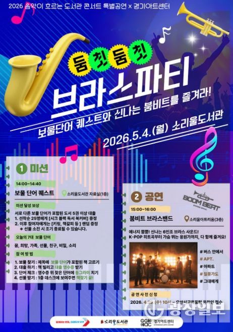 광장일보 나병석 기자 | 오산시 소리울도서관은 제104회 어린이날을 앞둔 오는 5월 4일 경기아트센터와 협업해 ‘2026 음악이 흐르는 도서관 콘서트’ 특별공연인 ‘둠칫둠칫 브라스 파티’를 개최한다고 밝혔다.