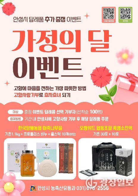 광장일보 주재영 기자 | 안성시는 오이데이와 5월 가정의 달을 맞아 고향사랑기부제 참여 확대와 지역 농산물 소비 촉진을 위해 ‘오이데이 이벤트’와 ‘가정의 달 이벤트’를 추진한다고 밝혔다.