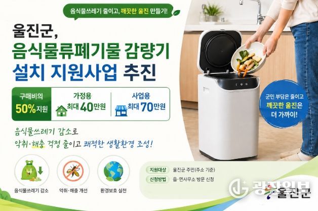 광장일보 주재영 기자 | 울진군은 음식물쓰레기의 발생량 감소와 군민 생활환경 개선을 위해 ‘음식물류폐기물 감량기 설치 지원사업(3차)’을 오는 5월 22일까지 선착순으로 모집한다.