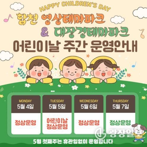 광장일보 주재영 기자 | 합천군은 5월 가정의 달을 맞아 5월 첫째 주(5.4.~5.6.)동안 합천영상테마파크와 대장경테마파크를 휴관일 없이 정상 운영한다고 28일 밝혔다.
