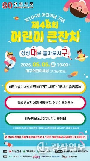 광장일보 주재영 기자 | 대구광역시는 제104회 어린이날을 맞아 어린이와 온 가족이 함께 즐길 수 있는 풍성한 문화·체험 행사를 시 전역에서 개최한다.