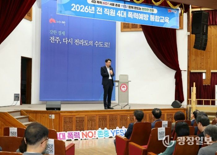 광장일보 주재영 기자 | 전주시는 28일 시청 강당에서 우범기 전주시장을 비롯한 5급 이상 간부 공무원 100여 명을 대상으로 ‘2026년 직장 내 4대 폭력 예방 통합교육’을 실시했다.
