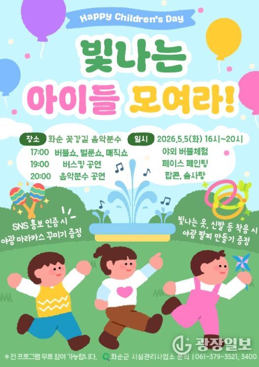 광장일보 주재영 기자 | 화순군은 어린이날을 맞아 아이와 가족이 함께 즐기는 대규모 체험형 축제를 마련해 ‘아동친화도시’의 면모를 한층 강화한다고 밝혔다.