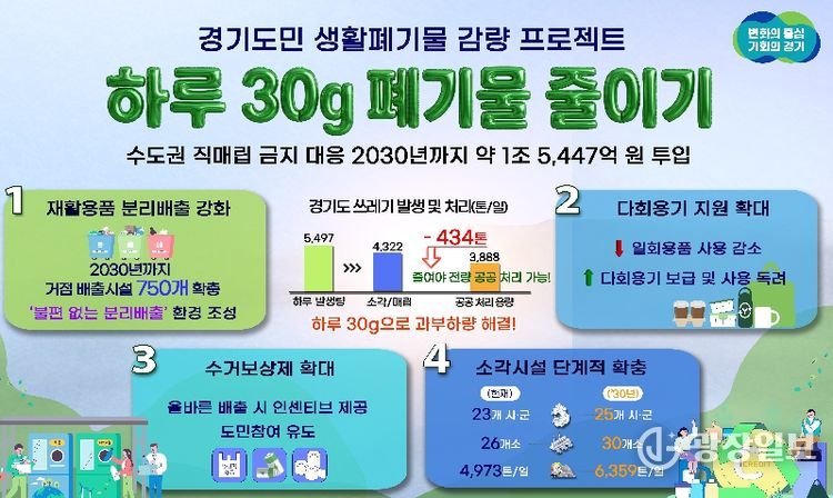 광장일보 주재영 기자 | 수도권 직매립 금지에 따른 생활쓰레기 감량을 위해 경기도가 2030년까지 5년간 약 1조 5,447억 원을 투입하는 ‘하루 30g, 도민실천형 생활폐기물 감량 프로젝트’를 추진한다.