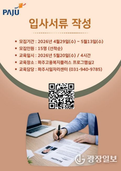 광장일보 주재영 기자 | 파주시는 중장년 구직자의 원활한 노동시장 재진입을 돕기 위해 ‘입사서류 작성 실습 교육’참여자 15명을 모집한다.