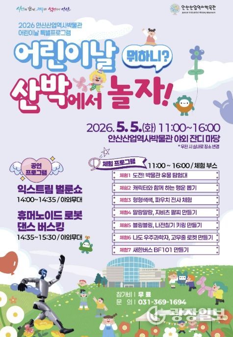 광장일보 주재영 기자 | 안산시는 내달 5일 어린이날을 맞아 안산산업역사박물관에서 어린이날 특별프로그램 ‘어린이날 뭐하니? 산박에서 놀자!’를 개최한다고 29일 밝혔다.