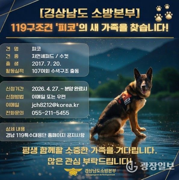 광장일보 주재영 기자 | 경상남도 소방본부는 각종 재난 현장에서 도민의 생명을 구하기 위해 활약해 온 119구조견 ‘피코’(저먼 셰퍼드, 29kg)가 6년간의 임무를 마치고 명예롭게 은퇴함에 따라, 제2의 견생을 함께할 가족을 찾고 있다고 밝혔다.