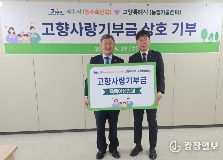 광장일보 나학천 기자 | 제주시는 4월 29일 고양특례시 농업기술센터에서 고양특례시와 고향사랑기부금 상호 전달식을 갖고 지역 간 상생과 협력 강화에 뜻을 모았다.
