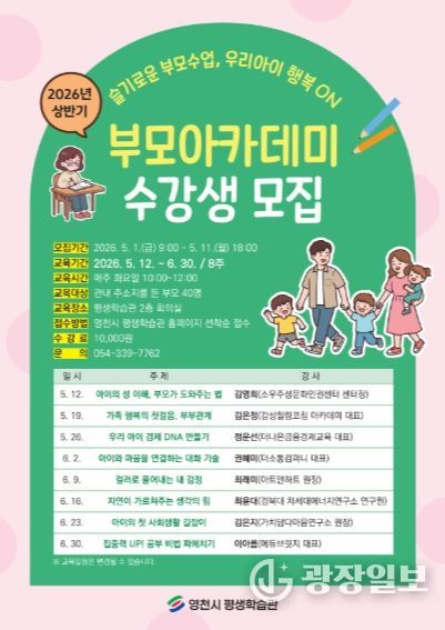 광장일보 주재영 기자 | 영천시 평생학습관은 5월 1일부터 11일까지 ‘2026년 상반기 부모아카데미’ 수강생을 모집한다.
