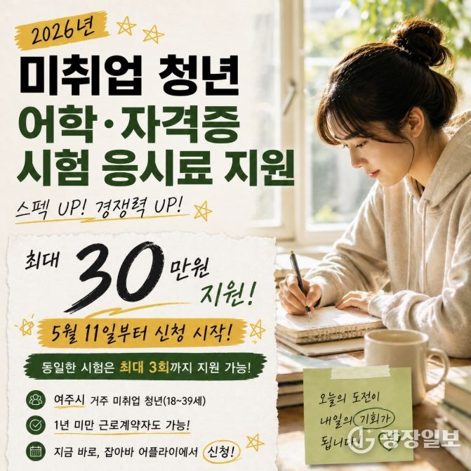 광장일보 주재영 기자 | 여주시는 오는 5월 11일부터 미취업 청년에 어학·자격시험 응시료를 지원하는 ‘경기청년 역량강화 기회지원’ 사업 접수를 시작한다.