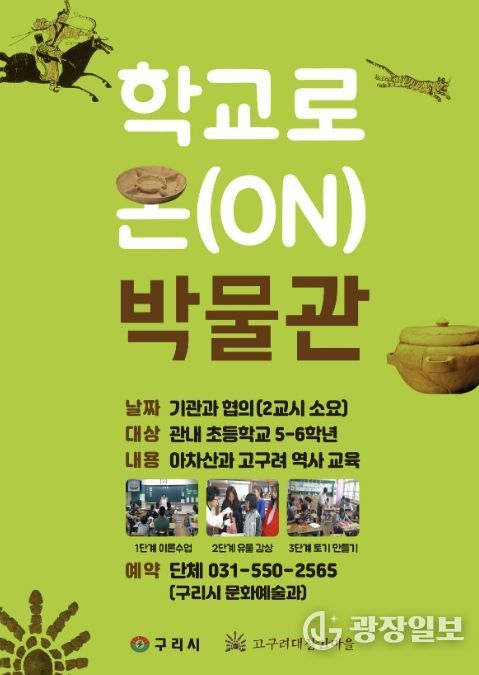 광장일보 주재영 기자 | 구리시는 4월 28일부터 오는 9월까지 고구려 유물 상자를 들고 관내 초등학교를 찾아가는 ‘학교로 온(ON) 박물관’프로그램을 운영한다고 밝혔다.