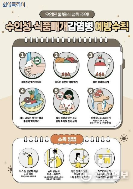 주요 예방수칙은 ▲흐르는 물에 비누로 30초 이상 손 씻기 ▲음식은 충분히 익혀 먹기 ▲물은 끓여 마시기 ▲채소와 과일은 깨끗이 씻어 섭취하기 ▲설사 증상 시 음식 조리 금지 ▲조리기구 구분 사용 등이다.