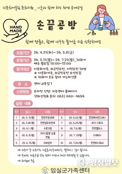 광장일보 주재영 기자 | 임실군 가족센터는 다문화가족·외국인주민·지역주민이 함께 천연 생활용품을 만들고 나누며 이웃 간 따뜻한 소통과 어울림을 경험할 수 있는 천연공예 프로그램 '손끝공방' 참여자를 모집한다.