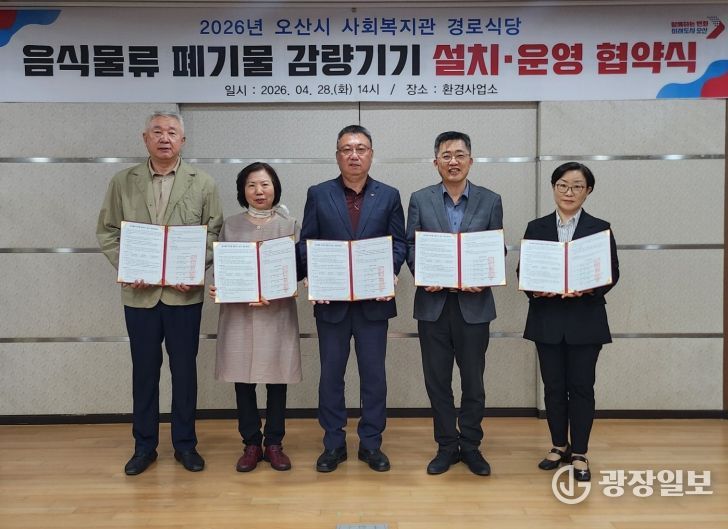 이번 협약은 노인 이용이 많은 경로식당에서 발생하는 음식물류 폐기물을 효과적으로 줄이고, 친환경적인 처리 기반을 마련하기 위해 추진됐다. 협약에는 오산시, 오산노인종합복지관, 세교복지재단, 오산남부종합사회복지관과 폐기물 감량기기 제조사까지 5개 기관이 참여했다.