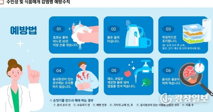 예방을 위해서는 ▲올바른 손씻기 생활화 ▲음식 충분히 익혀 먹기 ▲물 끓여 마시기 ▲설사 증상 시 음식 조리 금지 ▲위생적인 조리 환경 유지 등 개인위생 수칙을 철저히 지켜야 한다.