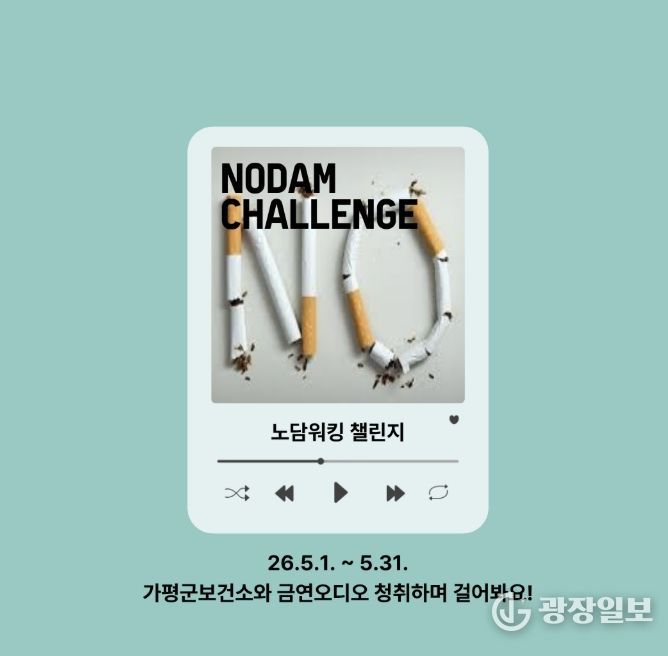 광장일보 주재영 기자 | 가평군보건소가 ‘세계 금연의 날’을 앞두고 5월 1일부터 한 달간 금연 인식 확산을 위한 ‘노담워킹 챌린지’를 진행한다. 이번 행사는 일상 속 걷기 실천과 금연 홍보를 병행해 군민들의 건강한 생활 습관 형성을 돕고자 마련됐다.