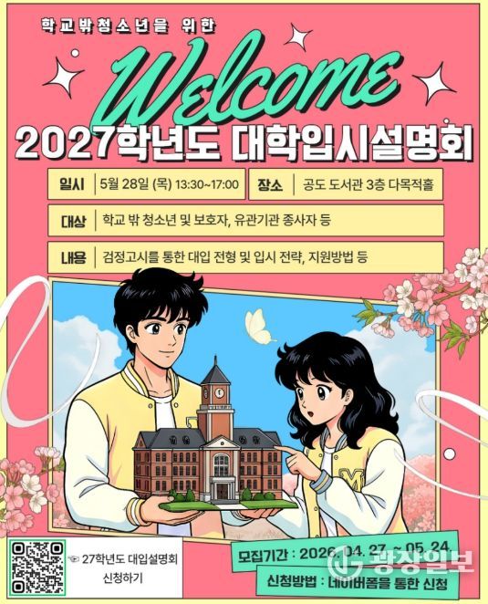 광장일보 주재영 기자 | 안성시학교밖청소년지원센터는 학교 밖 청소년의 성공적인 진학을 돕기 위해 오는 5월 28일 오후 1시 30분부터 공도 도서관 다목적홀에서 ‘2027학년도 대학 입시 설명회’를 개최한다고 밝혔다.