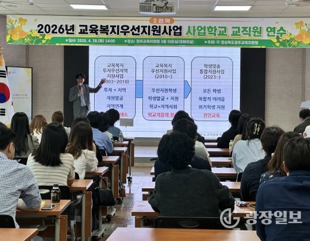 광장일보 주재영 기자 | 경상북도경주교육지원청은 2026년 4월 28일 경주교육지원청 다온실(3층 대회의실)에서 ‘2026년 교육복지우선지원사업 2권역 사업학교 교직원 연수’를 개최했다.