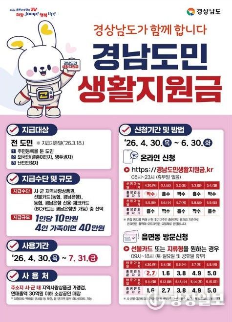 광장일보 주재영 기자 | 경상남도는 4월 30일부터 전 도민을 대상으로 한 ‘경남도민 생활지원금’ 지급 신청을 본격적으로 시작한다고 밝혔다. 이번 지원금은 고물가 등 어려운 경제 여건 속에서 도민들의 생계 부담을 덜고, 지역 내 소비를 촉진해 민생 경제에 활력을 불어넣기 위해 마련됐다.