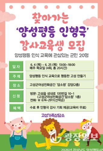 양성평등 인형극 강사에 관심이 있는 군민은 고성군여성친화공간 담소랑 1층 고성가족상담소에 방문 또는 전화로 신청 가능하다.