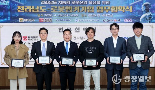 전남도는 29일 도청 서재필실에서 레인보우로보틱스, 두산로보틱스, 뉴로메카, 클로봇, 시즐 등 국내 로봇 앵커기업 5개사와 ‘지능형 로봇산업 육성을 위한 업무협약’을 했다.