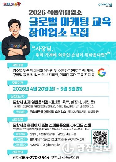 광장일보 주재영 기자 | 포항시는 외국인 고객 응대 역량을 강화하기 위해 ‘2026년 식품위생업소 글로벌 마케팅 교육’ 참여 업소 30개소를 모집한다.