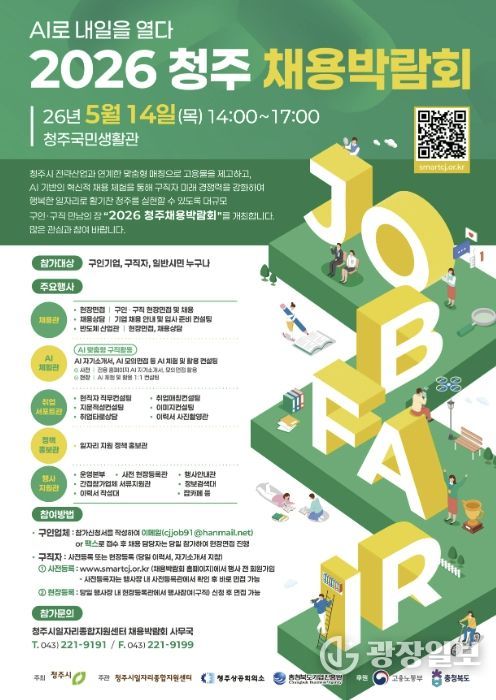 광장일보 이현나 기자 | 청주시는 오는 5월 14일 오후 2시 청주 올림픽기념국민생활관에서 '2026 청주채용박람회’를 개최한다고 30일 밝혔다.