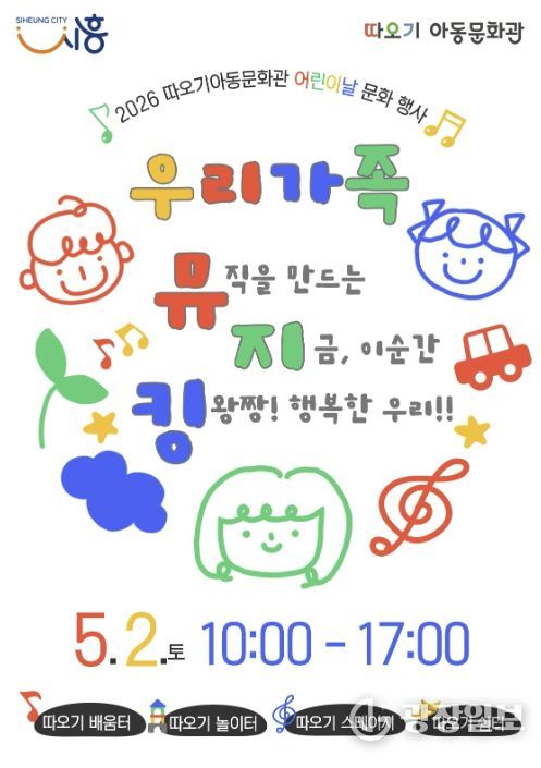 광장일보 주재영 기자 | 시흥시 따오기아동문화관은 어린이날을 맞아 오는 5월 2일 오전 10시부터 오후 5시까지 따오기아동문화관 야외 일대에서 2026년 어린이날 문화행사 ‘우리가족 뮤지킹’을 개최한다.