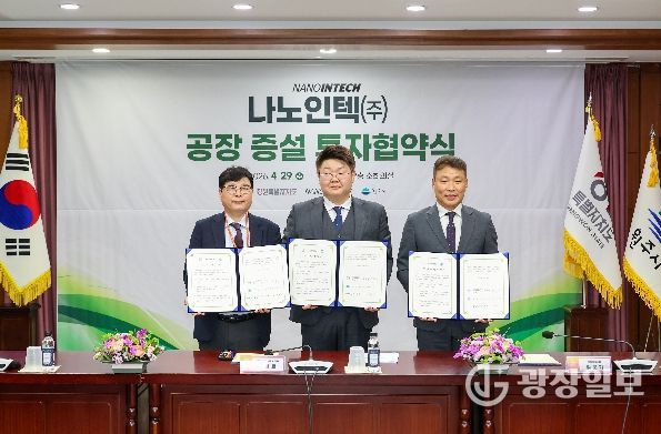 광장일보 이현나 기자 | 원주시와 강원특별자치도는 지난 29일 김문기 원주시장 권한대행, 심원섭 강원특별자치도 산업국장, 박병호 나노인텍㈜ 대표이사 등이 참석한 가운데 나노인텍㈜ 공장 증설을 위한 투자협약을 체결했다.