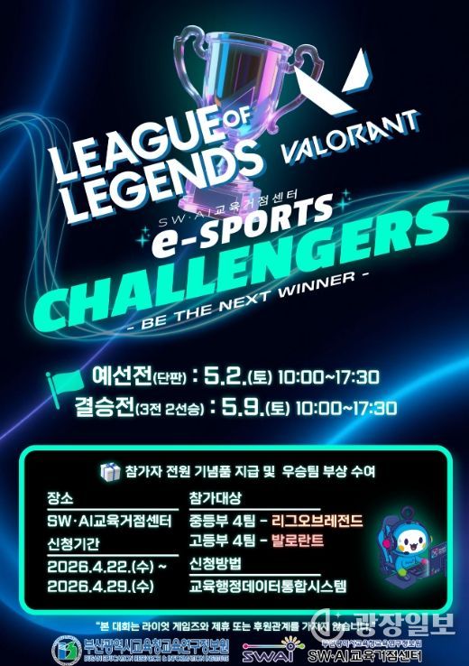 대회는 학생들에게 높은 관심을 받고 있는 ‘리그 오브 레전드’(중등부)와 ‘발로란트’(고등부) 2개 종목으로 운영된다. 예선은 단판 토너먼트 방식으로 진행하며, 결승은 3판 2선승제로 치러진다.