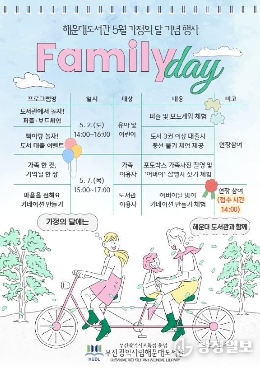 광장일보 주재영 기자 | 부산광역시립해운대도서관은 오는 5월 2일과 7일 해운대도서관 로비에서 어린이와 가족 이용자를 대상으로 ‘가정의 달 기념행사’를 운영한다.