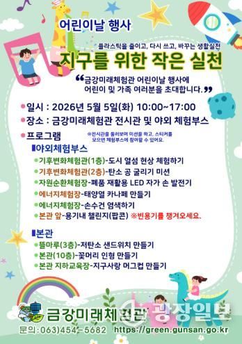 광장일보 주재영 기자 | 군산시 금강미래체험관이 어린이날을 맞아 5월 5일 오전 10시부터 오후 5시까지 체험관 전시관과 야외 체험부스 일원에서 어린이 및 가족 단위 관람객을 대상으로 어린이날 기념 환경체험 프로그램 ‘지구를 위한 작은 실천’을 운영한다.