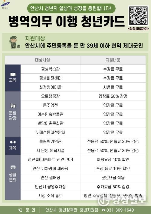 지원 대상은 안산시에 주민등록을 둔 39세 이하 제대군인이다. 신청은 안산시 통합예약시스템에서 할 수 있으며, 경기도 행정서비스 앱 ‘경기똑D’를 통해 모바일 카드로도 발급받을 수 있다.
