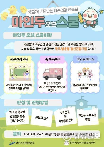 광장일보 주재영 기자 | 안산시 정신건강복지센터는 11월까지 관내 초·중·고등학교 총 10개교를 대상으로 학교로 찾아가는 정신건강사업 ‘마인두 오브 스쿨’을 운영한다고 30일 밝혔다.
