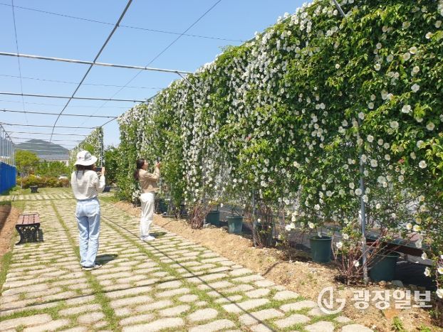 광장일보 주재영 기자 | 거제시농업기술센터의 거제시농업개발원에서는 2021년부터 거제 자생식물인 거제왕찔레의 신소득 작물로서의 가치를 평가하기 위해 울타리형 꽃벽을 조성·관리하고 있다.