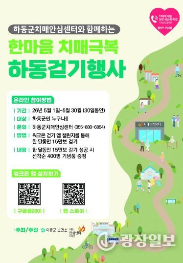 광장일보 주재영 기자 | 하동군 치매안심센터는 오는 5월 1일부터 30일까지 한 달 동안 치매에 대한 인식 개선을 위해 ‘한마음 치매극복 걷기 챌린지’를 운영한다고 밝혔다.