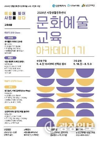 광장일보 주재영 기자 | 인천시 남동문화재단 서창생활문화센터는 오는 5월 18일부터 8월 5일까지 ‘2026년 서창생활문화센터 문화예술 교육 아카데미 1기’를 운영한다고 30일 전했다.