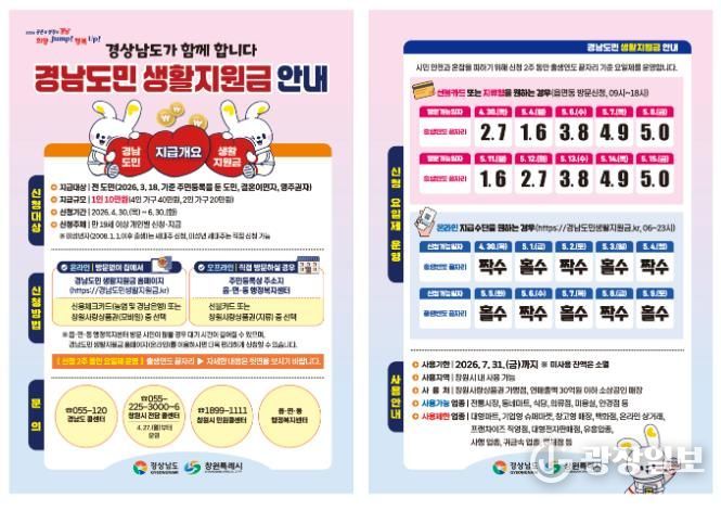 광장일보 주재영 기자 | 창원특례시는 고유가·고물가 등으로 가중된 민생 부담을 완화하기 위해 시행되는 ‘경남도민 생활지원금’ 지급을 오는 4월 30일부터 본격적으로 시작한다고 밝혔다.
