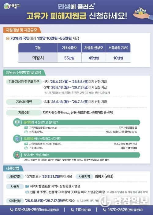 광장일보 주재영 기자 | 의왕시가 최근 중동 전쟁 여파로 인한 고유가·고환율·고물가로 어려움을 겪는 시민들을 지원하기 위해 추진 중인 '고유가 피해지원금' 지급 사업이 시행 초기부터 순조롭게 진행되고 있다.