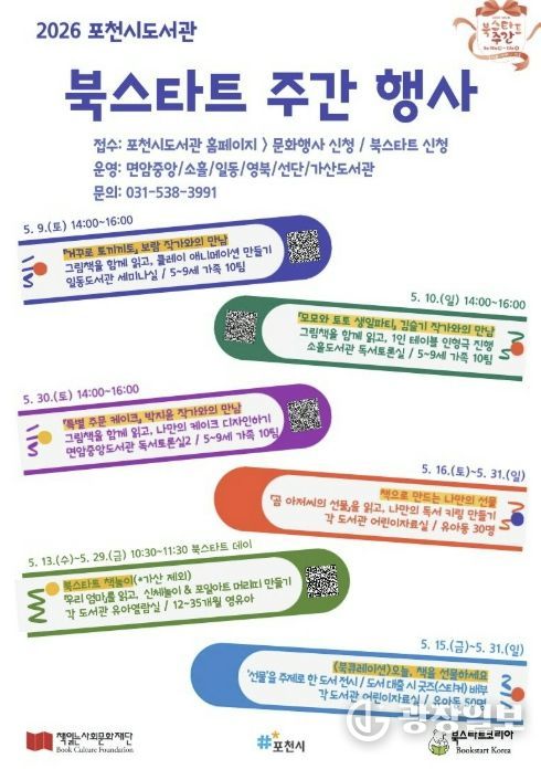 광장일보 주재영 기자 | 포천시도서관은 북스타트코리아와 책읽는사회문화재단이 주최하는 ‘2026 북스타트 주간 지원사업’에 선정됨에 따라, 5월 9일부터 면암중앙·소흘·일동·영북·선단·가산도서관 등 6개소에서 북스타트 주간 행사를 운영한다.