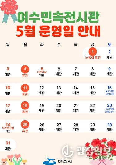 광장일보 주재영 기자 | 여수시는 5월 가정의 달을 맞아 여수민속전시관에서 어린이날 연휴(5월 2~5일)와 석가탄신일 연휴(5월 23~25일)에 맞춰 다양한 체험프로그램을 운영한다고 밝혔다.