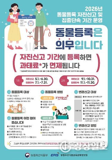 광장일보 주재영 기자 | 대구광역시는 반려견의 유기·유실을 방지하고 보호자의 책임 의식을 강화하기 위해 5월 1일부터 6월 30일까지 두 달간 ‘2026년 상반기 반려견 동물등록 자진신고 기간’을 운영한다.